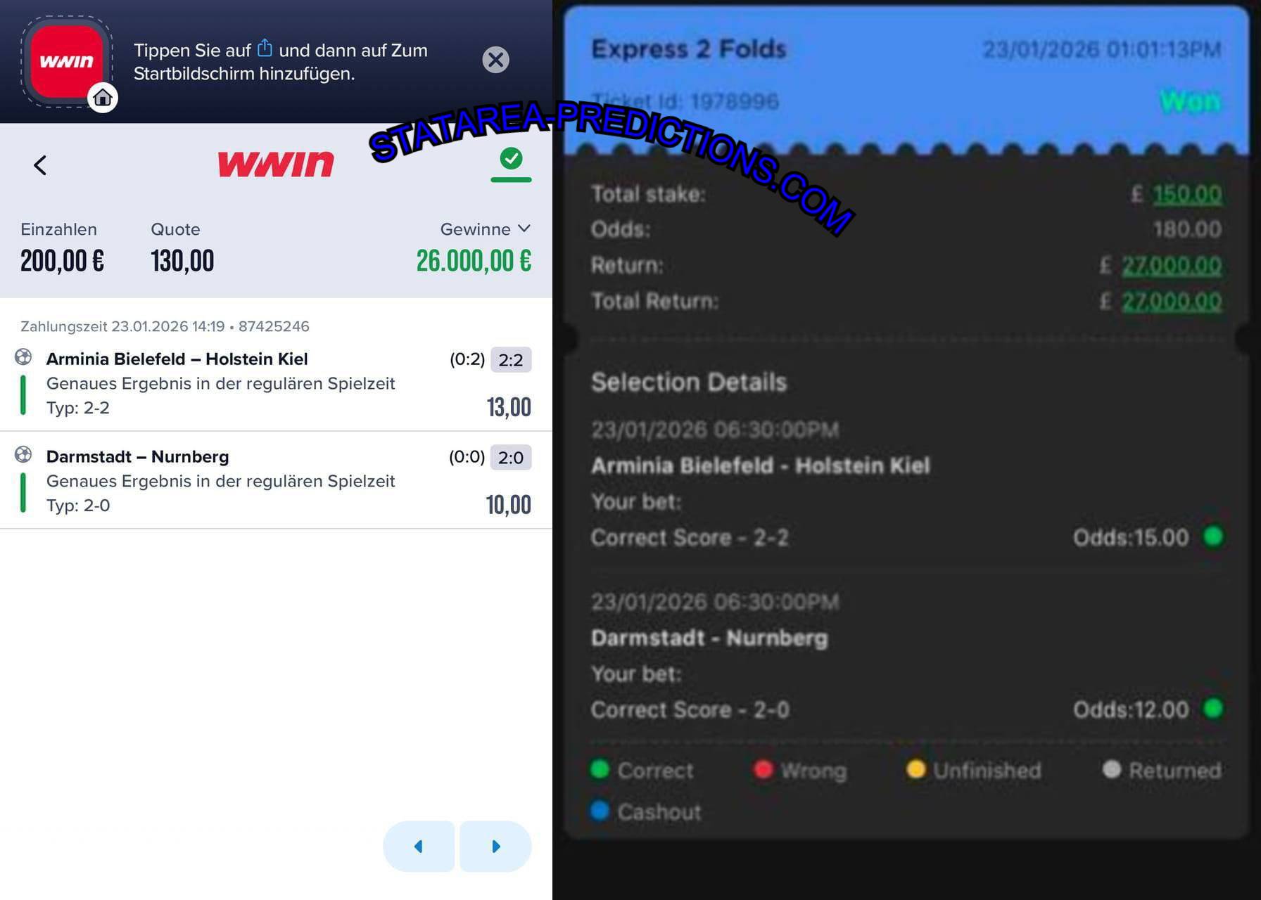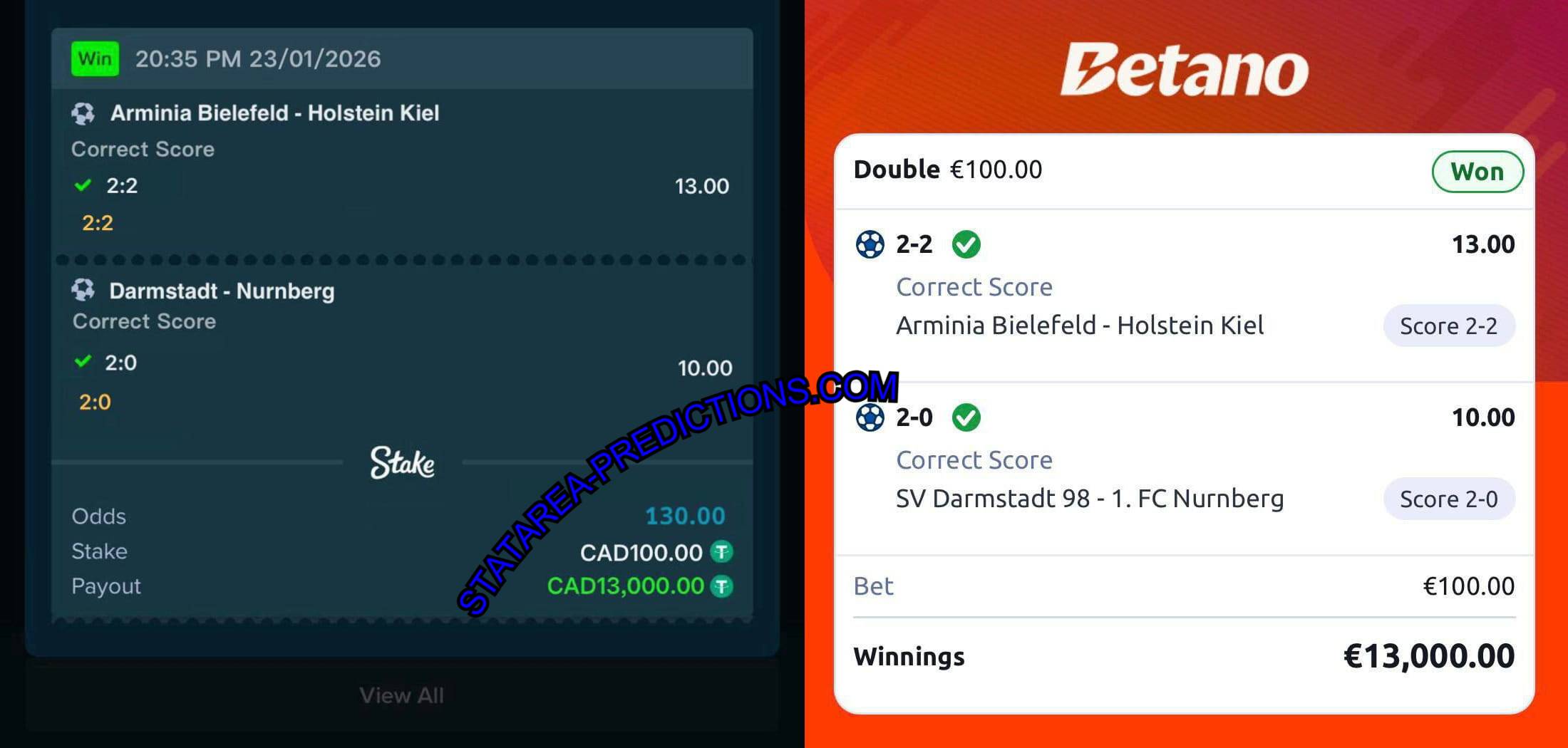 | Arminia Bielefeld vs Holstein Kiel | 2:2 (CS) | 13.00 | FT: 2:2 WIN |